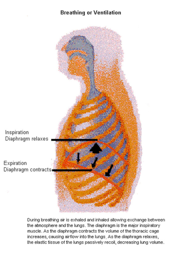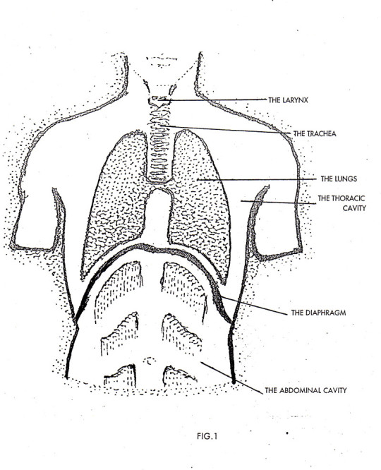 ---- As we can see in Fig.1 the body is split into two halves by a muscle called the Diaphragm, which acts like a partition - the two halves are the thoracic and abdominal cavities. As we suck in the air through our mouths, the rib cage swings out and our diaphragm, contracts (goes down) to allow our lungs to fill with air like a vacuum.